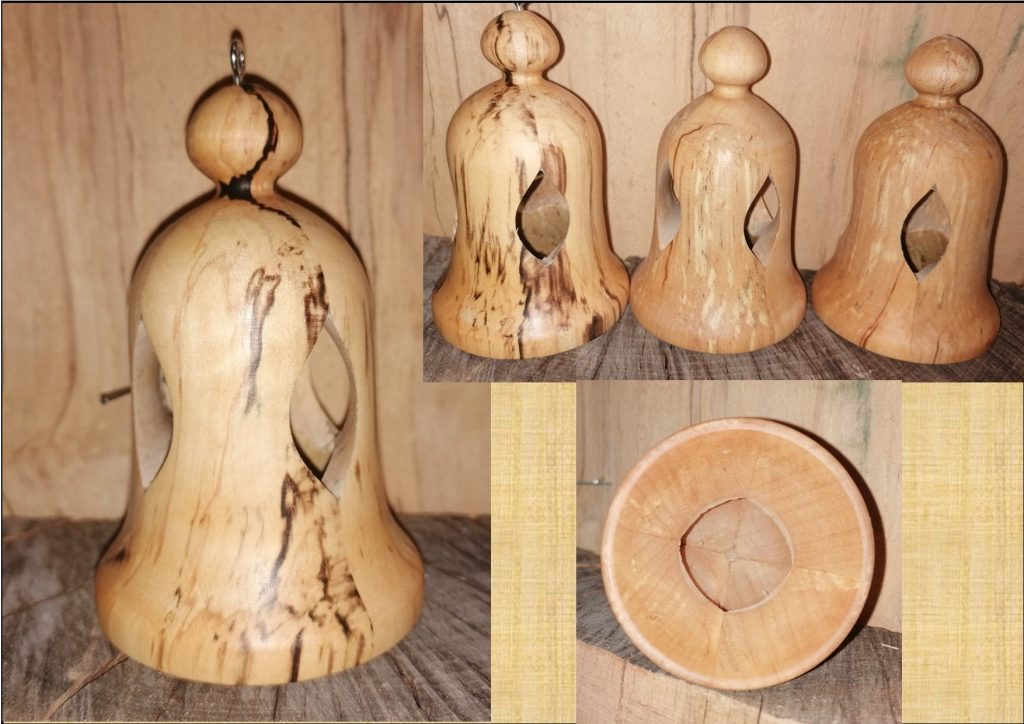 Handgefertigt aus regionaler Birke und mit Bienenwachs poliert. Die Glocken mit ca. Ø 7cm /h10cm sind der Farbgruppe 1 und 2 zugeordnet und mit Brandringen versehen. Geeignet für Innen- und geschützten Außenbereich