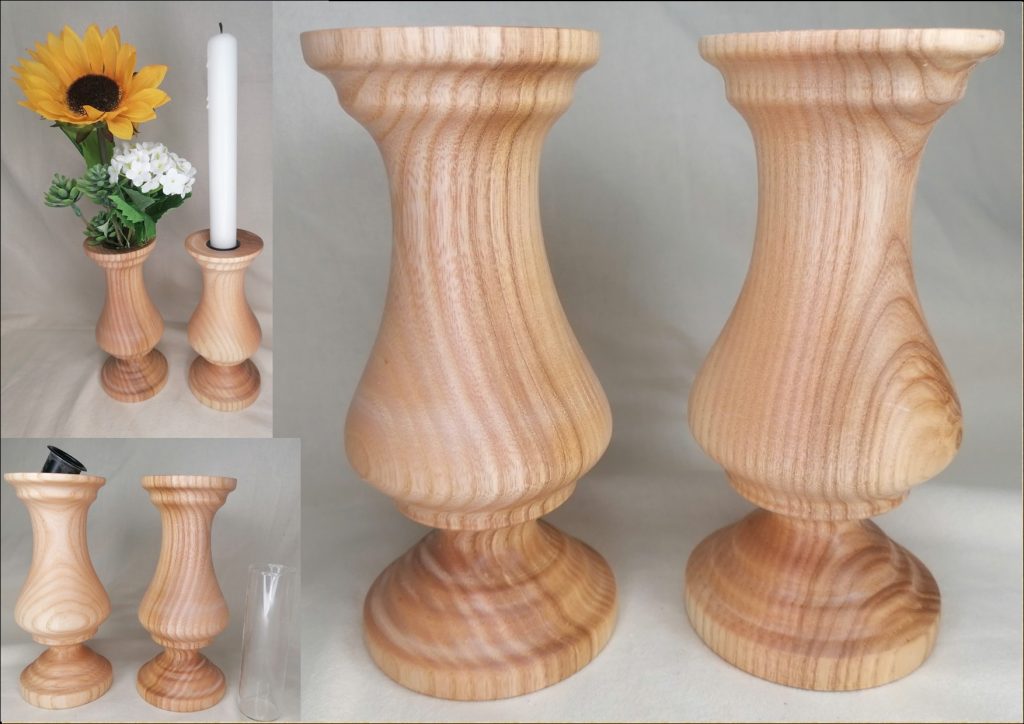 Handgedrechselter Kerzenhalter oder Blumenvase aus heimischer Esche mit Bienenwachs poliert. Ø65mm 155mm hoch für 22mm Stabkerzen / 30mm Glaseinsatz