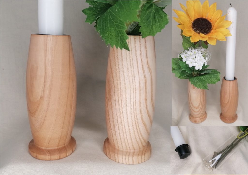 Handgedrechselter Kerzenhalter oder Blumenvase aus heimischer Esche mit Bienenwachs poliert. Ø48mm 100mm hoch für 22mm Stabkerzen / 20mm Glaseinsatz