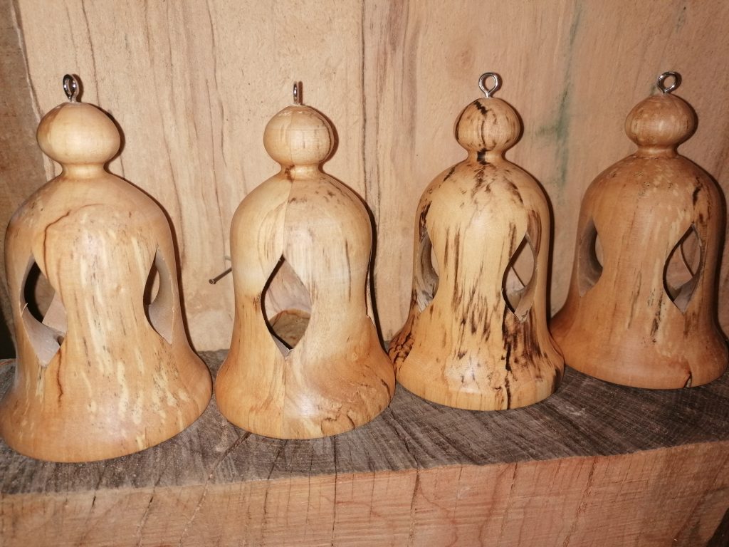 Handgefertigt aus regionaler Birke und mit Bienenwachs poliert. Die Glocken mit ca. Ø 7cm /h10cm sind der Farbgruppe 1 und 2 zugeordnet und mit Brandringen versehen. Geeignet für Innen- und geschützten Außenbereich