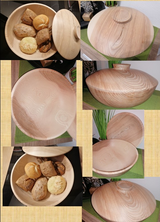 D09 Brotttopf Ø 31 x 16 cm  Esche (nicht verleimt) unbehandelte Oberfläche, der Deckel kann auch als eigene Servierplatte genutzt werde